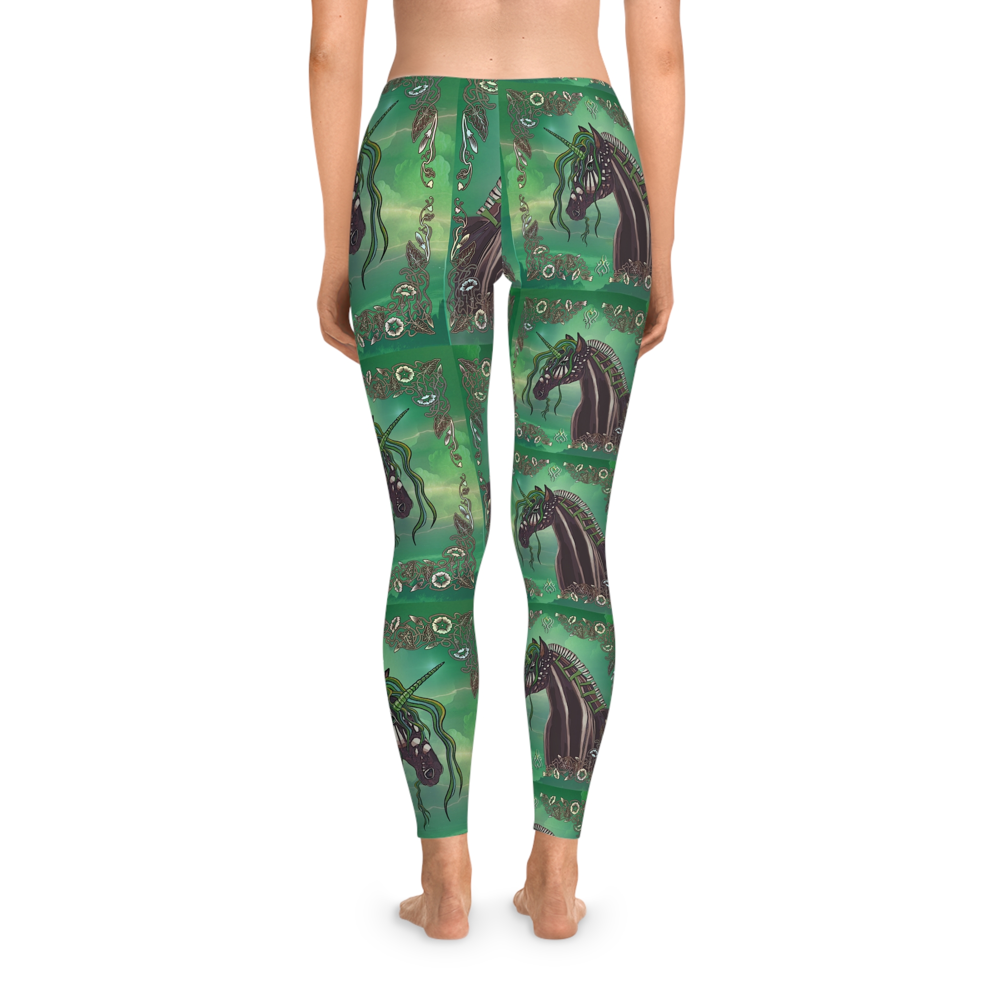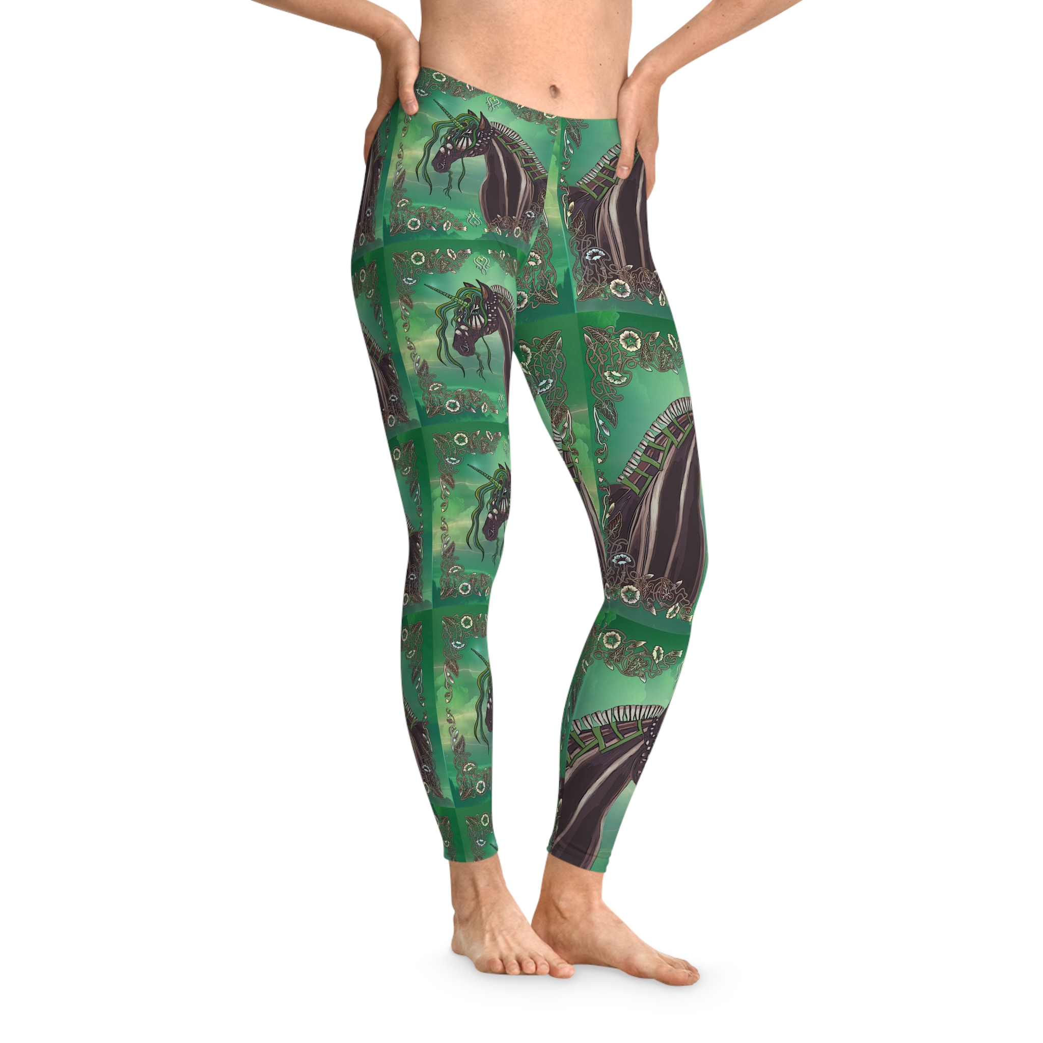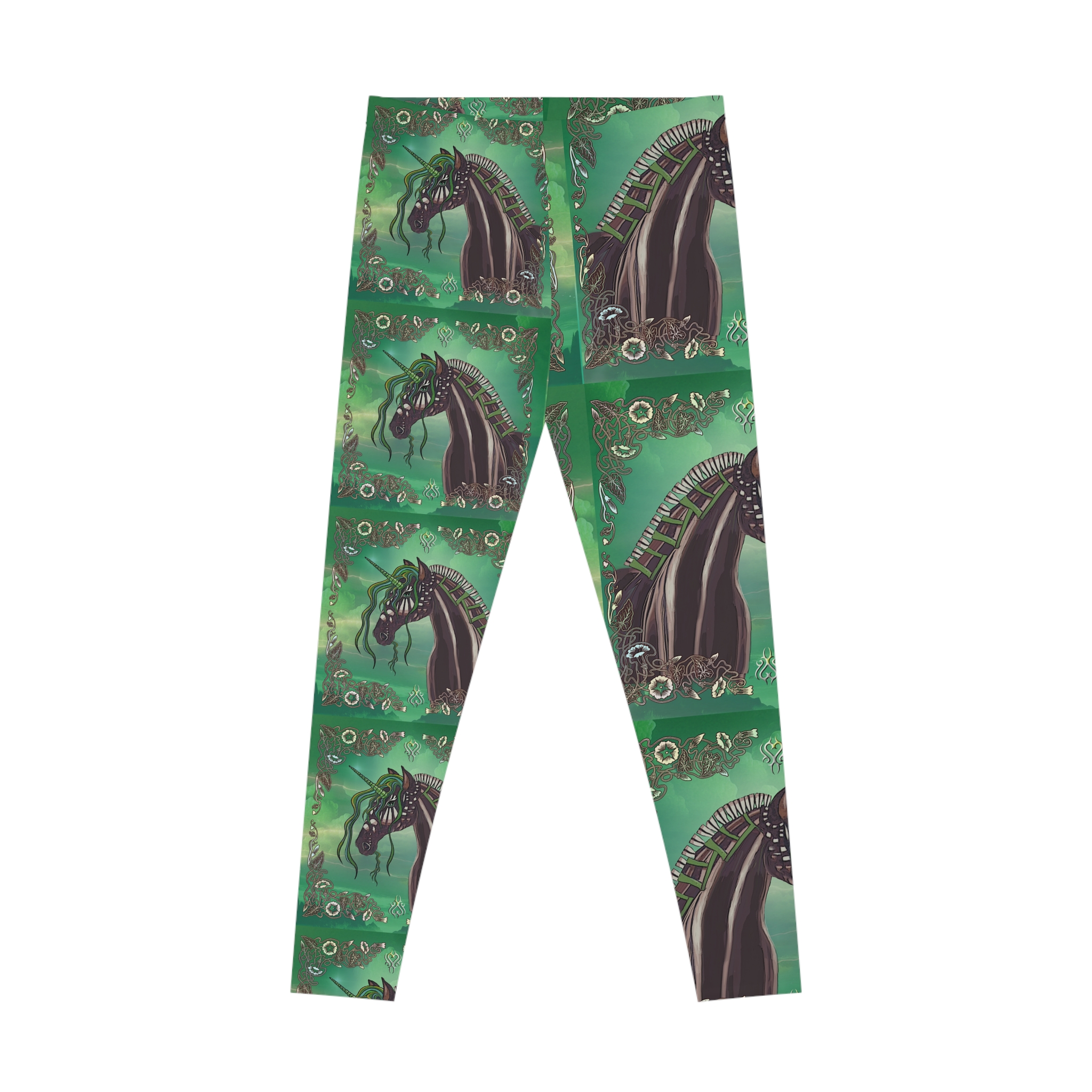 Slip into these ankle-length leggings and let your wardrobe whisper magic. Deep green waves and a repeating image of a sculpted unicorn with flowing tendrils create a moody, tapestry that moves with you. The mid-rise cut and thin elastic waist sit comfortably beneath tunics and cropped sweaters, while the smooth, seam-reduced surface keeps the printed art uninterrupted. Wear them for long walks along foggy piers, late-night sketch sessions, or quiet mornings curled up with your sketchbook — they hold up to movement and stretches of creative focus without losing their vivid color. These leggings fit into a life that favors atmospheric detail, tactile comfort, and pieces that tell a story every time you wear them.